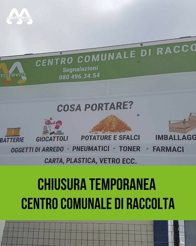 Si informa che il Centro Comunale di Raccolta resterà chiuso a partire da lunedì 23 febbraio 2026 e fino a data da destinarsi, per lavori di manutenzione straordinaria.